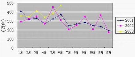 1.固定电话:保持快速增长势头。1-6月,全国固定电话用户新增2338.8万户,达到2.38亿户,比上年同期增长19.6%,平均月新增389.8万户,远高于2001、2002年的月均新增296.2、282.1万户。其中,城市电话用户新增1522.3万户,达到1.51亿户;农村电话用户新增816.5万户,达到0.87亿户。2001-2003年固定电话用户各月净增比较情况如图2所示。