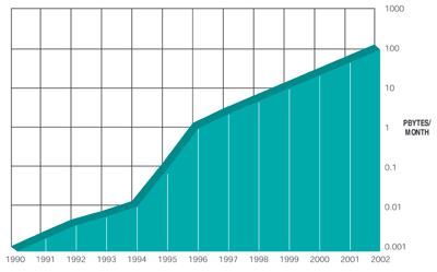 到1998年底,公用网中的数据通信业务量超过了电话通信业务量(参考文献1)。从此,互联网通信业务量的增长率从每年45%上升到100%。这种增长率与报刊上神话般夸大的每季度甚至每100天通信业务量翻一番的报道(参考文献2)--这些报道甚至使最虔诚的Mooresian也汗颜--形成对比。