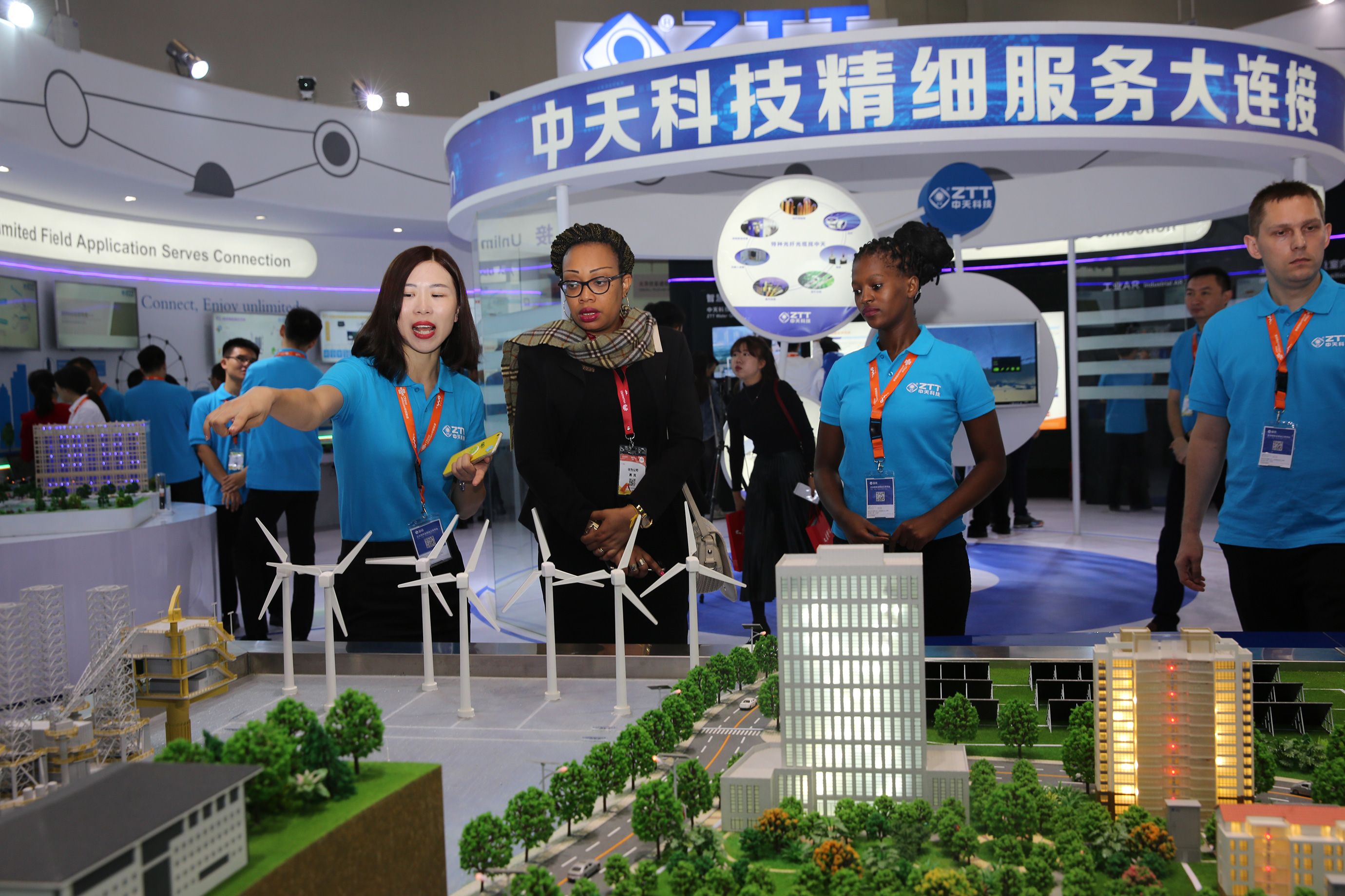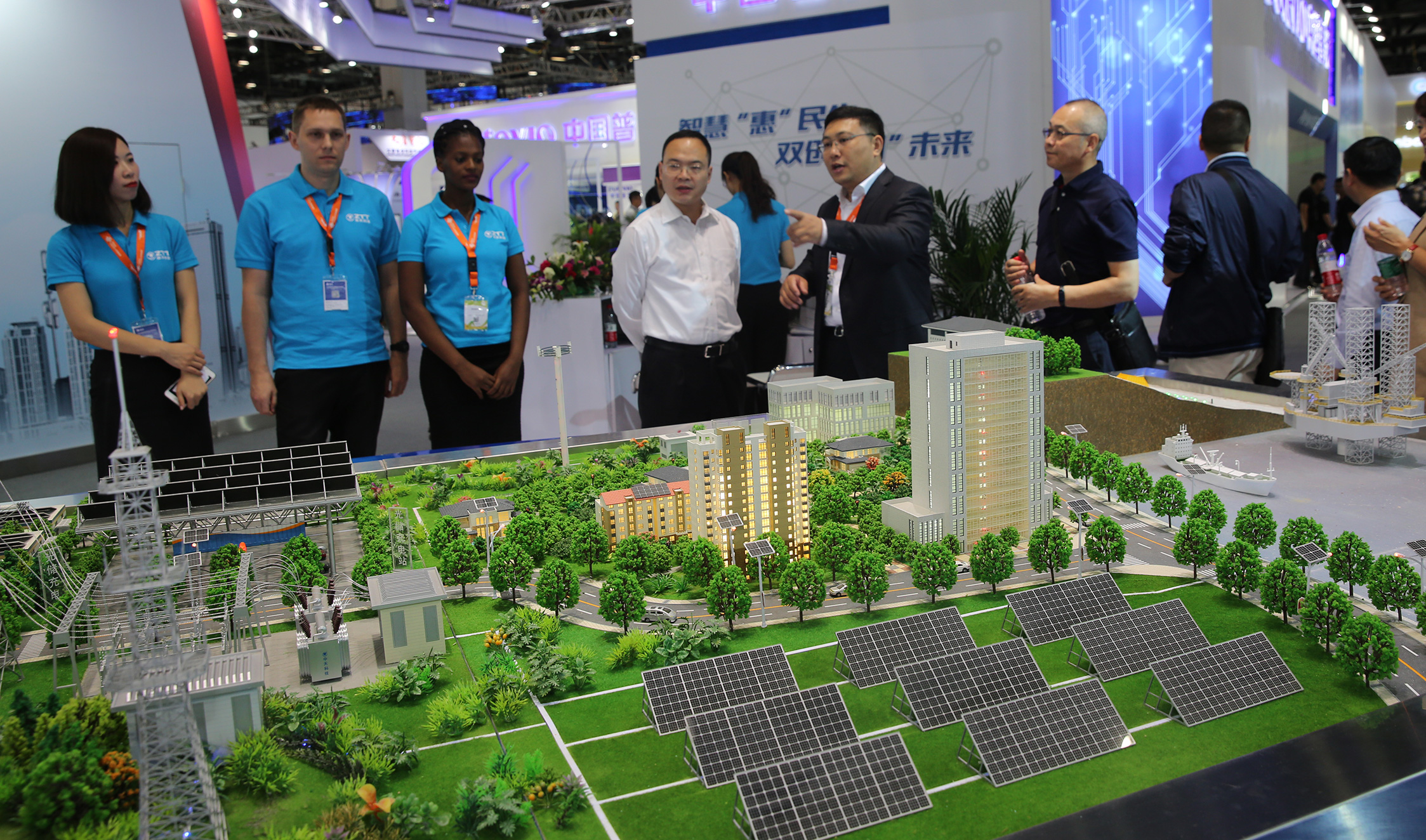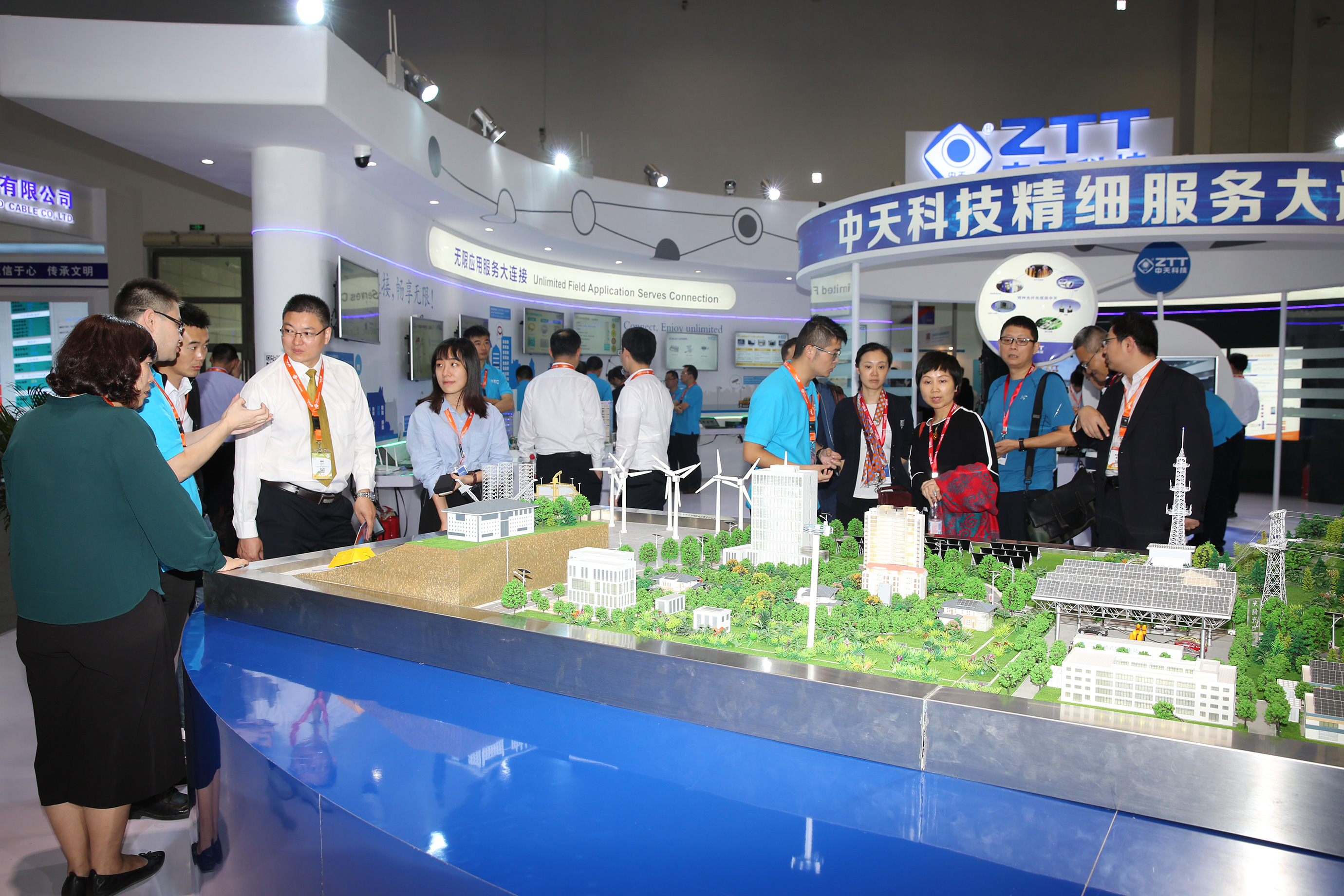 首先映入眼帘的是德赢VWIN科技展出的沙盘模型,该沙盘以智慧城市建设为依托,集中展示了德赢VWIN在通信、电网、新能源、海洋系统、轨道交通等领域的综合实力,吸引了各大运营商领导、专家技术人员以及众多外国友人前来咨询与探讨。