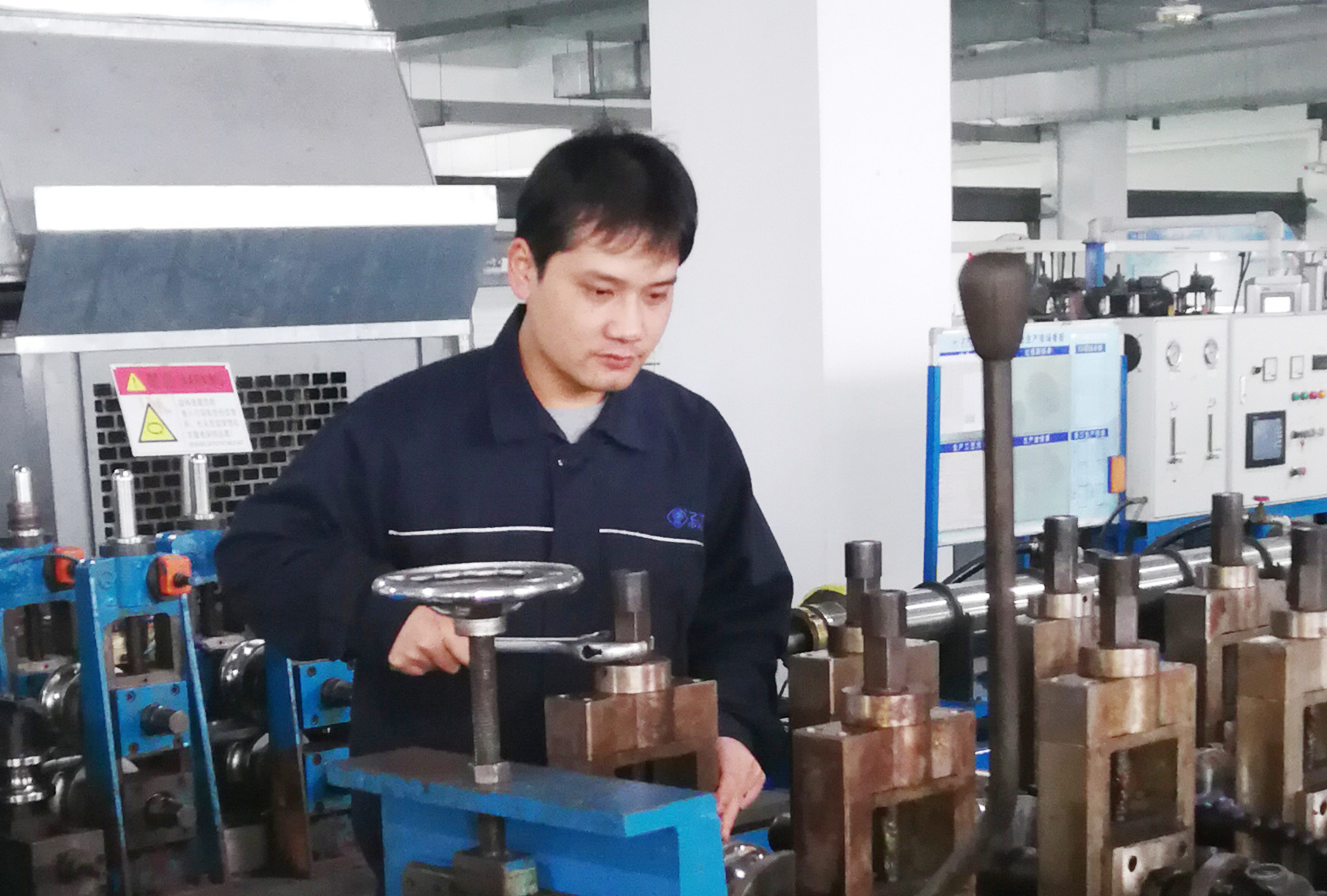 2017至2018年,陶志刚参与模具调试的机会越来越多,一年的学习,已让他熟练掌握了钢管成型技术。有段时间钢管经常出现直线度不符合工艺要求的问题,陶志刚通过检查定径段模具安装、受力大小、机组前后差速、轴承情况,夹具安装、校直模具安装、定径段模具润滑等,解决了存在额问题。陶志刚体会到,一个问题的出现有这么多的影响因素,细节的把控是机组稳定运转的关键。自此,陶志刚开始从每一道模具的中心校正、坞针的磨削、焊枪的架设、芯棒的位置、整平轮的高度、压力的大小、抛光轮的角度、力度、固溶温度等细节入手,把细节做到位,从而在真正意义上让调试出来的产品满足工艺要求。