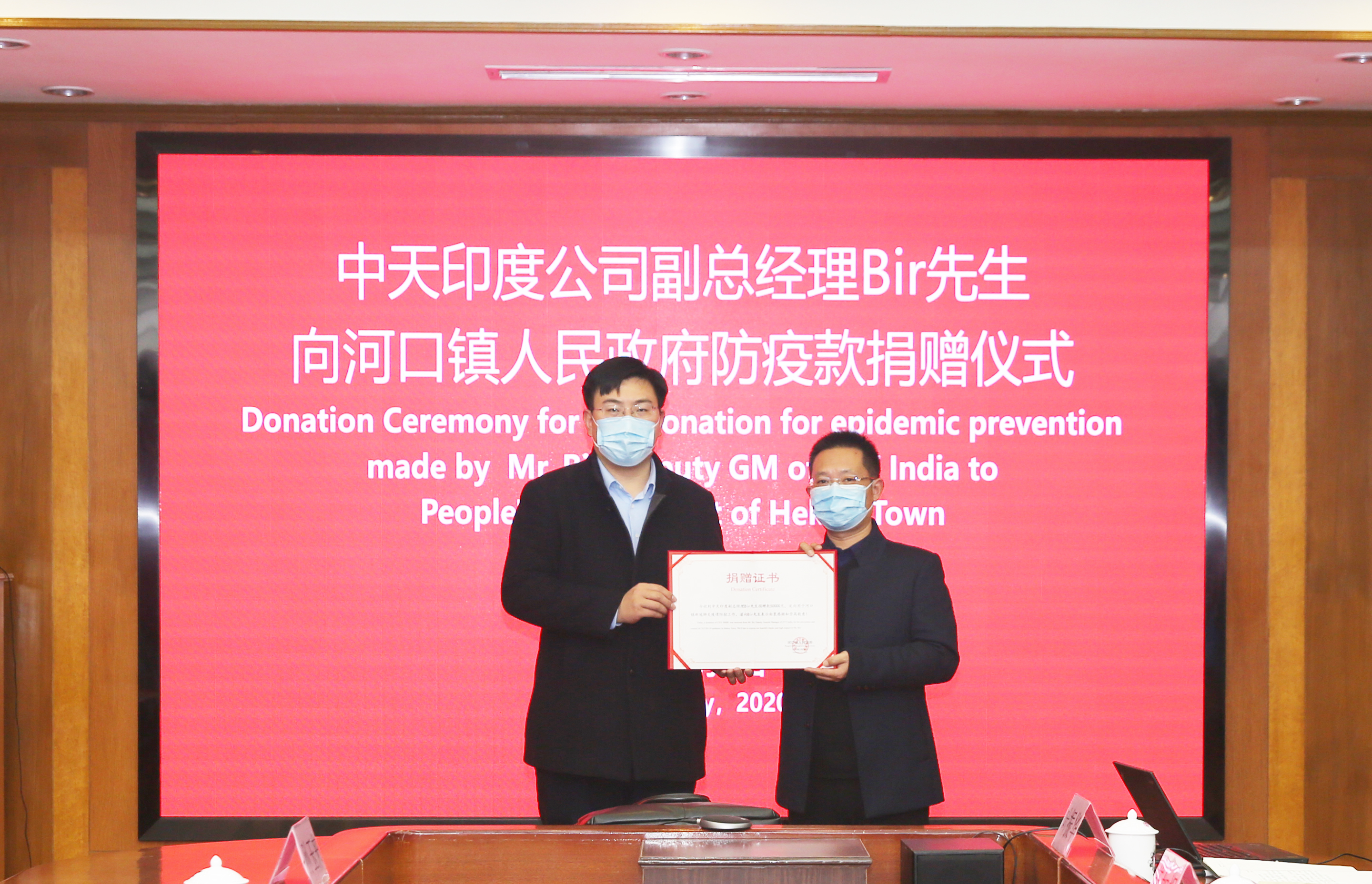 2月25日下午,在德赢VWIN科技如东本部举行了一场特殊的跨国捐赠仪式。德赢VWIN科技旗下德赢VWIN科技印度有限公司(简称“德赢VWIN印度”)副总经理Bir先生向德赢VWIN科技发祥地如东县河口镇捐款5万元支持防疫工作,深度诠释了“战疫无国界”的高尚情操。Bir先生通过视频连线参加捐赠仪式,德赢VWIN印度总经理陈兆峰代表Bir先生进行捐赠,河口镇党委副书记、镇长孙玉来向Bir先生颁发了捐赠证书。